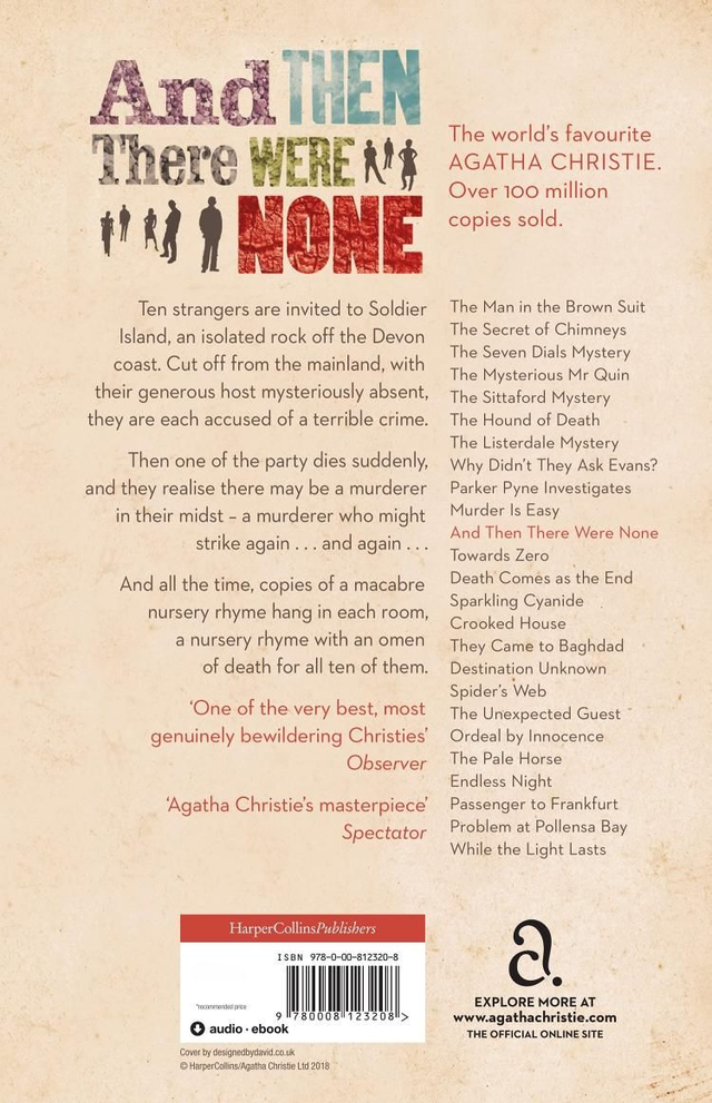 The 10 strangers include a reckless playboy, a troubled Harley Street doctor, a formidable judge, an uncouth detective, an unscrupulous mercenary, a God-fearing spinster, two restless servants, a highly decorated general and an anxious secretary. One by one they are picked off. Who will survive? And who is the killer? Copies of an ominous nursery rhyme hang in each room, the murders mimicking the awful fates of its ‘Ten Little Soldier Boys’.