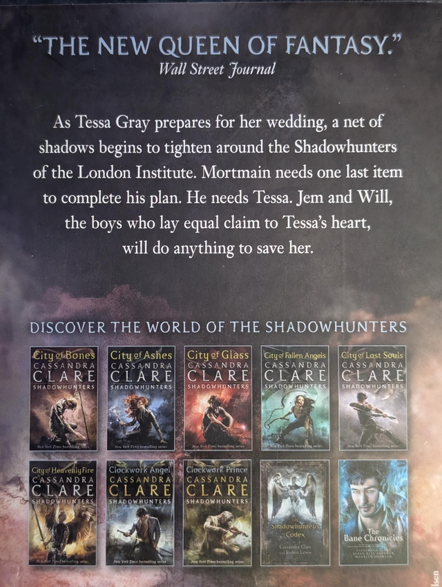 As Tessa Gray prepares for her wedding, a net of shadows begins to tighten around the Shadowhunters of the London Institute. Mortmain needs one last item to complete his plan. He needs Tessa. Jem and Will, the boys who lay equal claim to Tessa's heart, will do anything to save her.