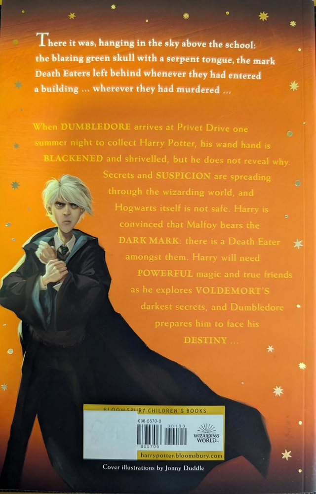 When DUMBLEDORE arrives at Privet Drive one summer night to collect Harry Potter, his wand hand is BLACKENED and shrivelled, but he does not reveal why. Secrets and SUSPICION are spreading through the wizarding world, and Hogwarts itself is not safe. Harry is convinced that Malfoy bears the DARK MARK: there is a Death Eater amongst them. Harry will need POWERFUL magic and true friends as he explores VOLDEMORT'S darkest secrets, and Dumbledore prepares him to face his DESTINY.