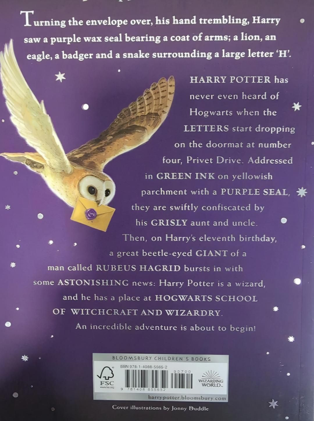 HARRY POTTER has never even heard of Hogwarts when the LETTERS start dropping on the doormat at number four, Privet Drive. Addressed in GREEN INK on yellowish parchment with a PURPLE SEAL, * they are swiftly confiscated by his GRISLY aunt and uncle. Then, on Harry's eleventh birthday, a great beetle-eyed GIANT of a man called RUBEUS HAGRID bursts in with some ASTONISHING news: Harry Potter is a wizard, and he has a place at HOGWARTS SCHOOL OF WITCHCRAFT AND WIZARDRY.
