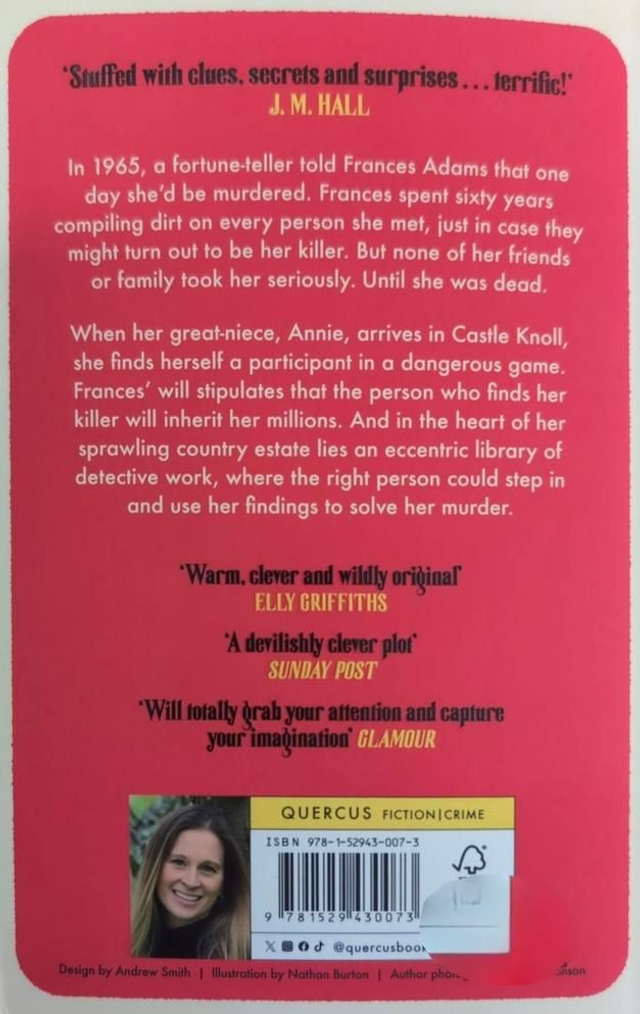 When her great-niece, Annie, arrives in Castle Knoll, she finds herself a participant in a dangerous game. Frances' will stipulates that the person who finds her killer will inherit her millions. And in the heart of her sprawling country estate lies an eccentric library of detective work, where the right person could step in and use her findings to solve her murder.