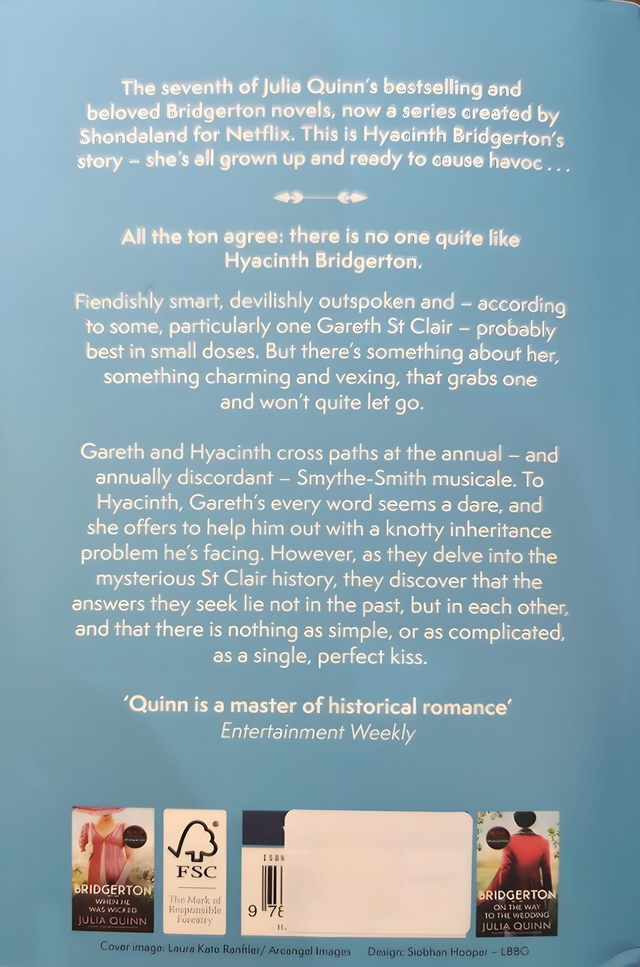 Gareth and Hyacinth cross paths at the annual - and annually discordant - Smythe-Smith musicale. To Hyacinth, Gareth's every word seems a dare, and she offers to help him out with a knotty inheritance problem he's facing. However, as they delve into the mysterious St Clair history, they discover that the answers they seek lie not in the past, but in each other, and that there is nothing as simple, or as complicated, as a single, perfect kiss.