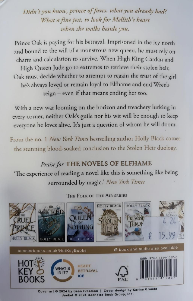 Prince Oak is paying for his betrayal. Imprisoned in the icy north and bound to the will of a monstrous new queen, he must rely on charm and calculation to survive. When High King Cardan and High Queen Jude go to extremes to retrieve their stolen heir, Oak must decide whether to attempt to regain the trust of the girl he's always loved or remain loyal to Elfhame and end Wren's reign even if that means ending her too.