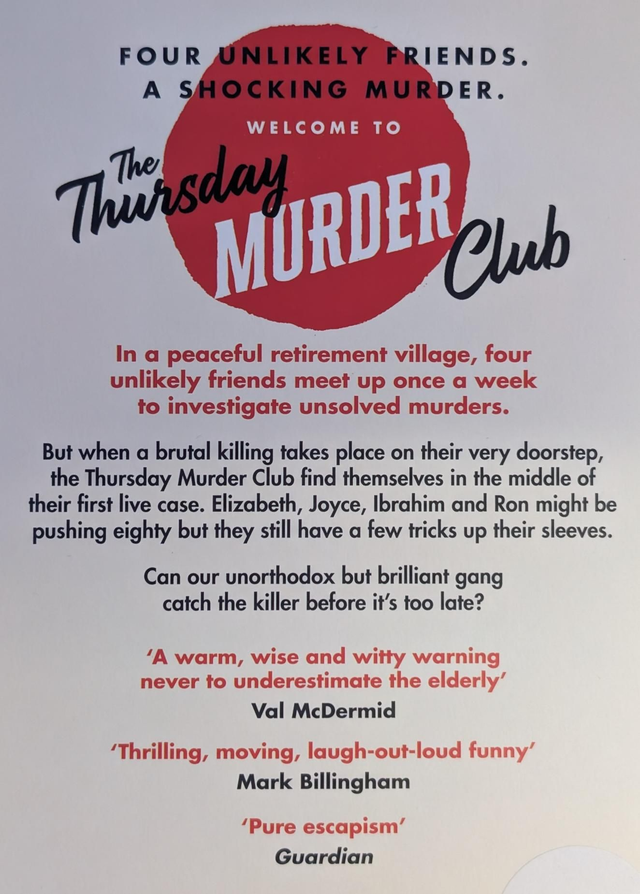 But when a brutal killing takes place on their very doorstep, the Thursday Murder Club find themselves in the middle of their first live case. Elizabeth, Joyce, Ibrahim and Ron might be pushing eighty but they still have a few tricks up their sleeves.