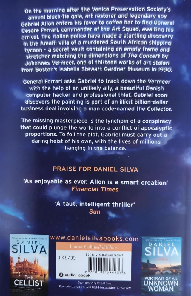 On the morning after the Venice Preservation Society's annual black-tie gala, art restorer and legendary spy Gabriel Allon enters his favorite coffee bar to find General Cesare Ferrari, commander of the Art Squad, awaiting his arrival. The Italian police have made a startling discovery in the Amalfi villa of a murdered South African shipping tycoon - a secret vault containing an empty frame and stretcher matching the dimensions of The Concert by Johannes Vermeer, one of thirteen works of art stolen from Boston's Isabella Stewart Gardner Museum in 1990.