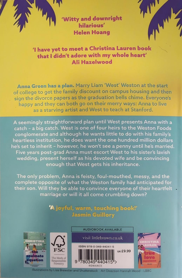 Anna Green has a plan. Marry Liam 'West' Weston at the start of college to get the family discount on campus housing and then sign the divorce papers as the graduation bells chime. Everyone's happy and they can both go on their merry ways: Anna to live as a starving artist and West to teach at Stanford.